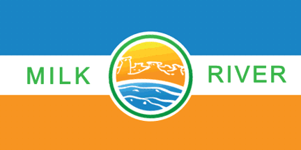 The flag’s design begins with its horizontal tricolor pattern. The top and bottom stripes are blue and orange, respectively, with a white stripe in between. The blue stripe symbolizes the river for which the town is named—the Milk River. Blue is often associated with water and tranquility, and this color highlights the town's connection to the river that runs through the region. The orange stripe at the bottom of the flag evokes feelings of warmth and energy. It may be interpreted as a nod to the natural beauty and the agricultural life of the area, as well as the sun that bathes the land in warmth throughout the year. Together, these colors convey the town's natural environment, agricultural heritage, and the importance of the Milk River as a vital water source.
