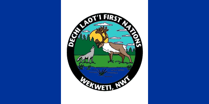 Positioned prominently in the center is a circular badge that serves as the focal point of the flag. This badge features a black ring that encircles the design, with white lettering at the top and bottom. The words “Dechi Laot’i First Nations” are inscribed at the top, indicating the community’s affiliation with this Indigenous group, while “Wekweètì, NWT” appears at the bottom, situating the flag within its geographic and political context.